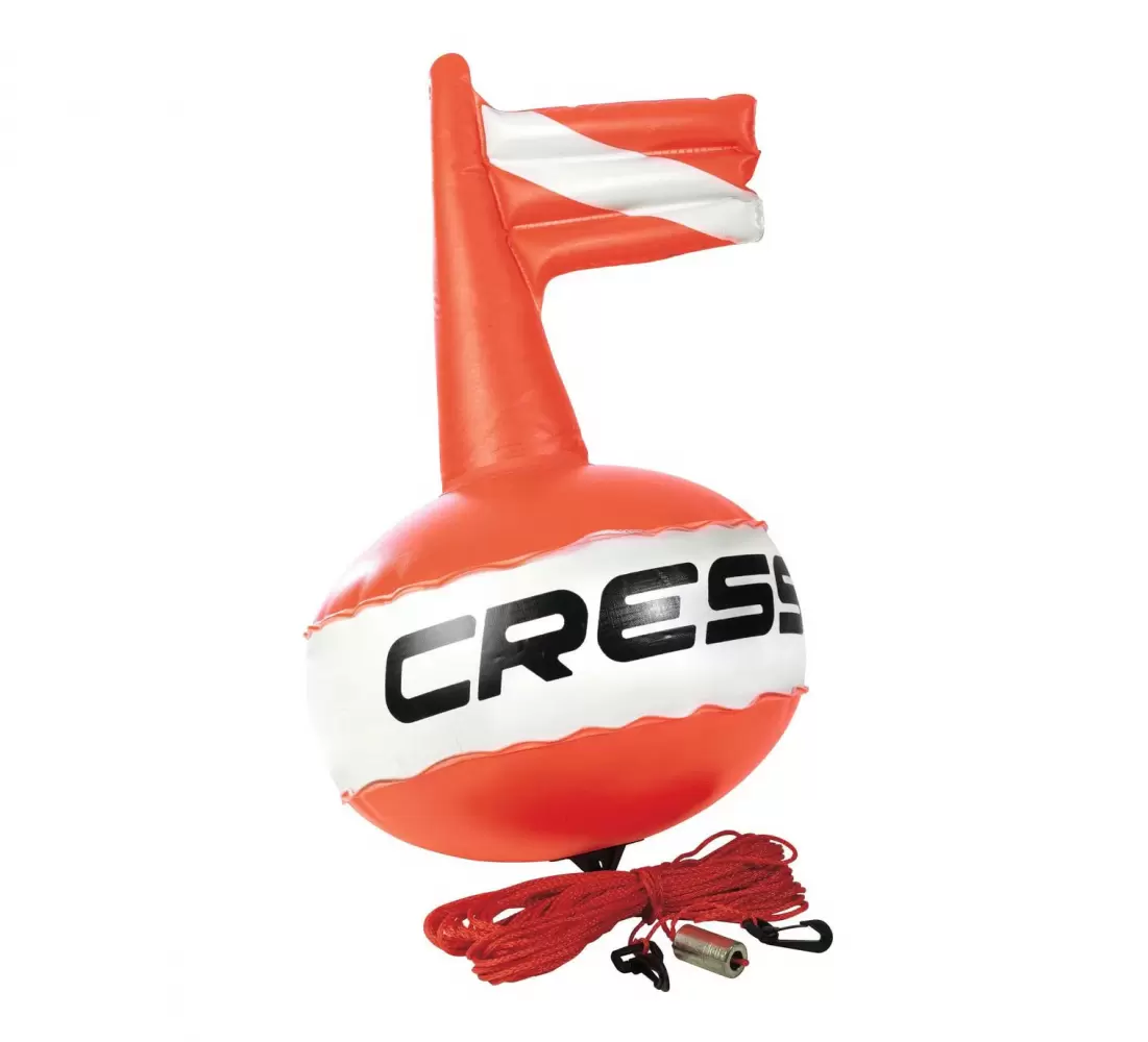 Cressi-Sub Conpetition Buoy — буй сферической формы слегка приплюснут для меньшего сопротивления ветру и оснащен встроенным надувным флагом. Изготовлен из PVC, и имеет прочную точку крепления лески на нижней половине. Поставляется в комплекте с легкой леской длиной 25 м, которая имеет небольшой цилиндрический свинцовый груз массой 150 г.