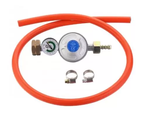 Комплект состоит из регулятора, датчика давления в цилиндре, газового шланга 85 см и хомутов.